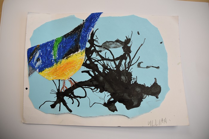 Kunstitunnis valmisid imeilusad tööd lindudest. Puuoksa puhusime tuśi ja kõrre abil, linnu värvisime õlipastellidega ja kleepisime oksale: