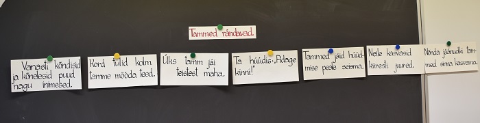 Tänase päeva teemaks oli "Mets". Teemasse häälestumiseks luges õpetaja kaks korda ette loo "Tammed rändavad". Nüüd pani õpetaja tahvlile lausekaardid segamini järjekorras ning lapsed seadsid need õigesse järjekorda.